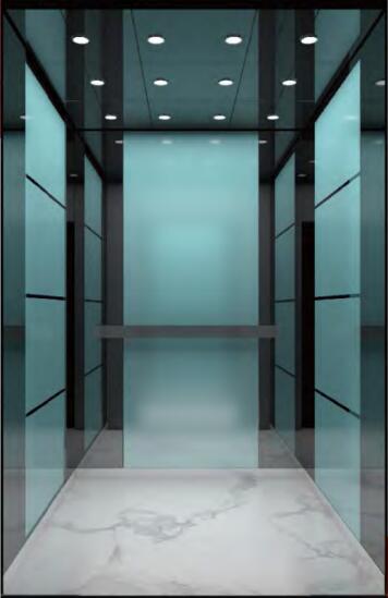 吊頂:鈦黑鏡面不銹鋼,簡燈 轎壁:鈦黑鏡面不銹鋼,綠色磨 砂玻璃,UV踢腳線 扶手:鈦黑扁扶手 地板:大理石