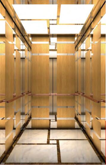 吊頂:鏡面不銹鋼,異形造型,有機(jī)透光板 轎壁:三側(cè)轎壁中間板木飾面嵌鏡而不銹鋼條, 輔助板鏡面不銹鋼,前壁境面不銹鋼 扶手:玫瑰全圓管扶手 地板:大理石