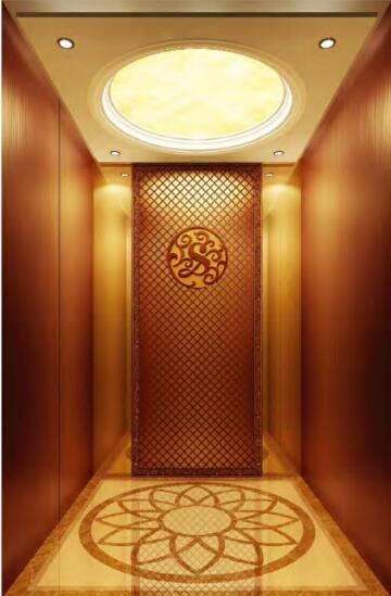 吊頂:木質(zhì)造型頂,透光云石,LED燈 轎壁:后壁中間板古銅色鏡面蝕刻不銹鋼。輔助板古 銅色鏡而不銹鋼,兩側(cè)壁及前壁古銅色發(fā)紋不銹鋼 扶手:無 地板:大理石