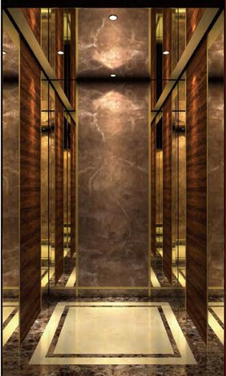 吊頂:古銅色烤漆鋼板,鏡面不銹鋼,筒燈 轎壁:后壁中間板彩紋鋼板,輔助板鈦金鏡面不銹鋼, 側(cè)壁中間板木飾面.輔助板鈦金鏡面不銹鋼,前壁鈦金鏡面不銹鋼 扶手:無(wú) 地板: PVC